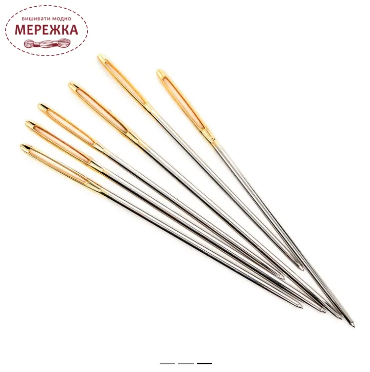 Гобеленові голки преміум-класу із золотим вушком у багаторазовій скляній банці з кришкою з матового срібла.