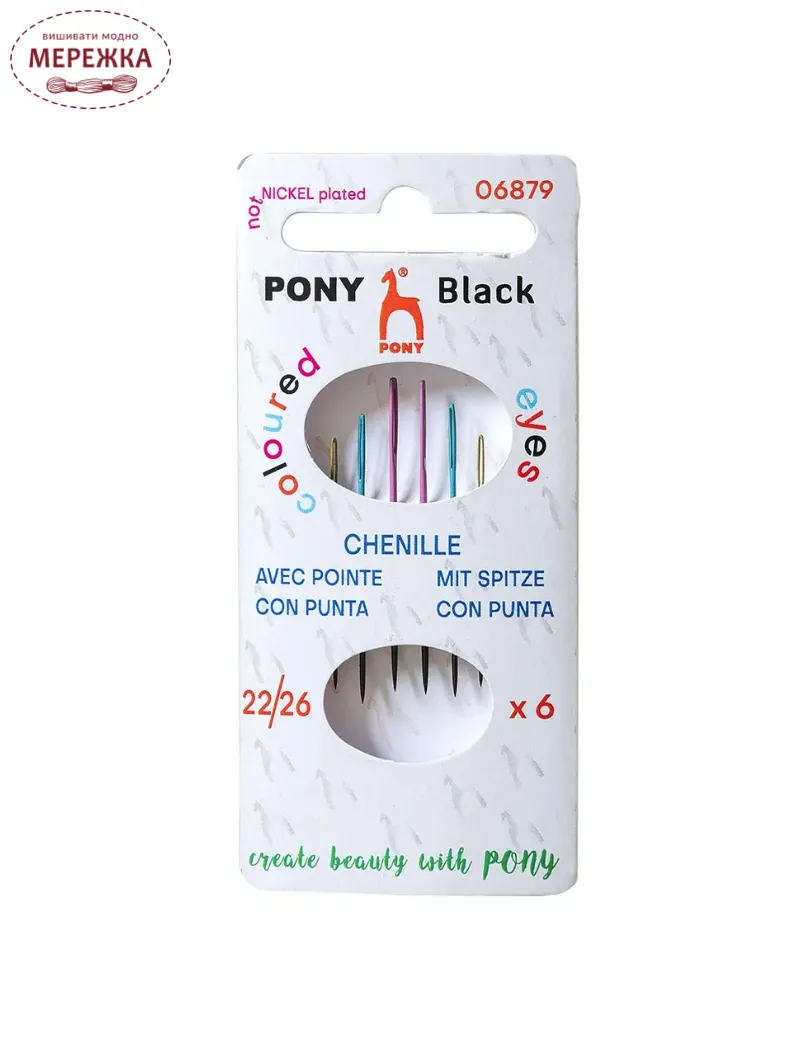 Синельні голки PONY чорного кольору мають кольорові вічка та матове чорне покриття на кінчику, що приємніше для ока, ніж блискуча голка. Більше того, чорний кінчик чудово контрастує зі світлими тканинами. Кожна голка має свій власний колір, що дозволяє легко ідентифікувати різні розміри. Завдяки гострому кінчику ці голки ідеально підходять для складної вишивки на щільних тканинах. Синельні голки - гладкі,з видовженим вушком, що дозволяє легко вставляти в них кілька ниток або товстішу пряжу, таку як вовна. Голка виготовлена з ненікельованої вуглецевої сталі.
