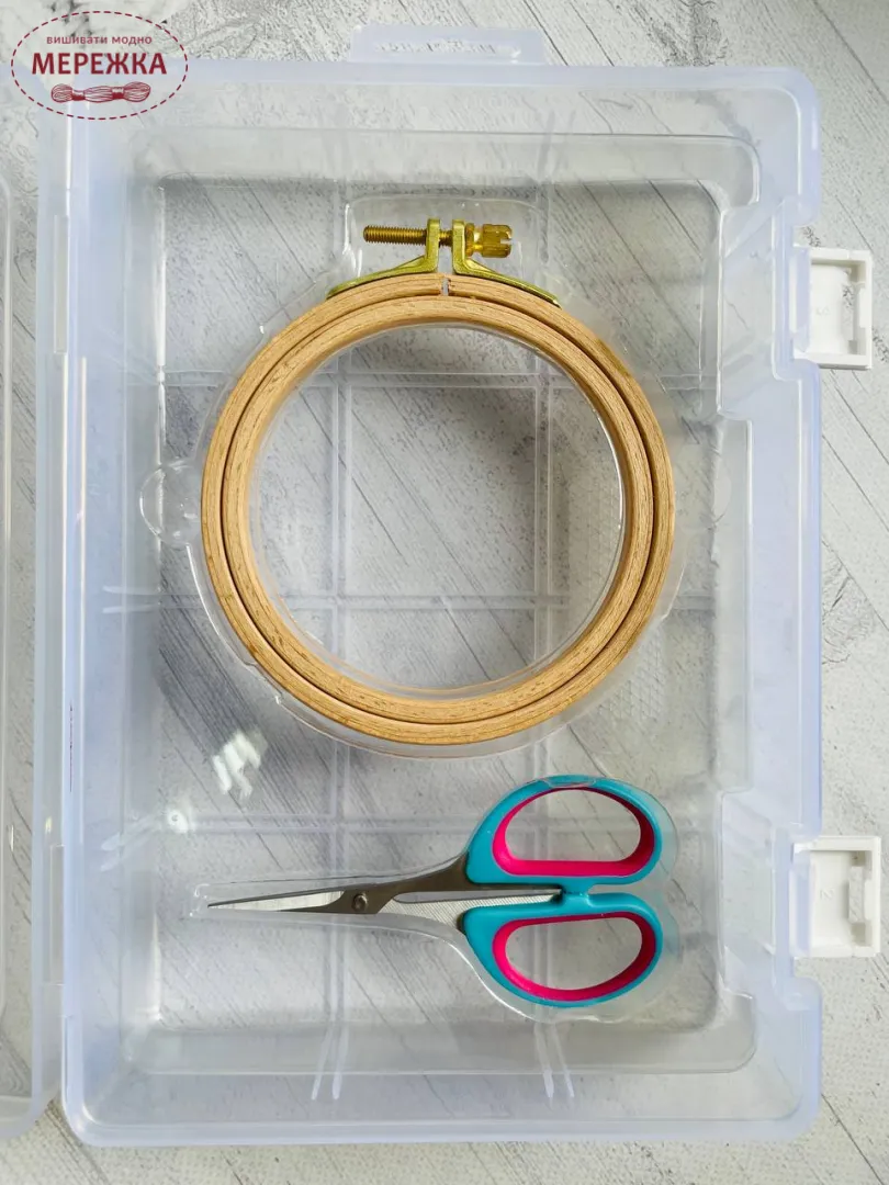 У двох відділеннях боксу знаходяться усі важливі базові вишивальні інструменти. Цей набір допоможе початківцям вдало зробити свої перші кроки у світі вишивки.