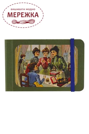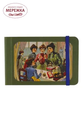 Цей чарівний міні-блокнот застібається на яскраво-блакитну гумку. Обкладинка прикрашена одним з наших улюблених мотивів: пані у вінтажному швейному клубі на зеленому тлі.