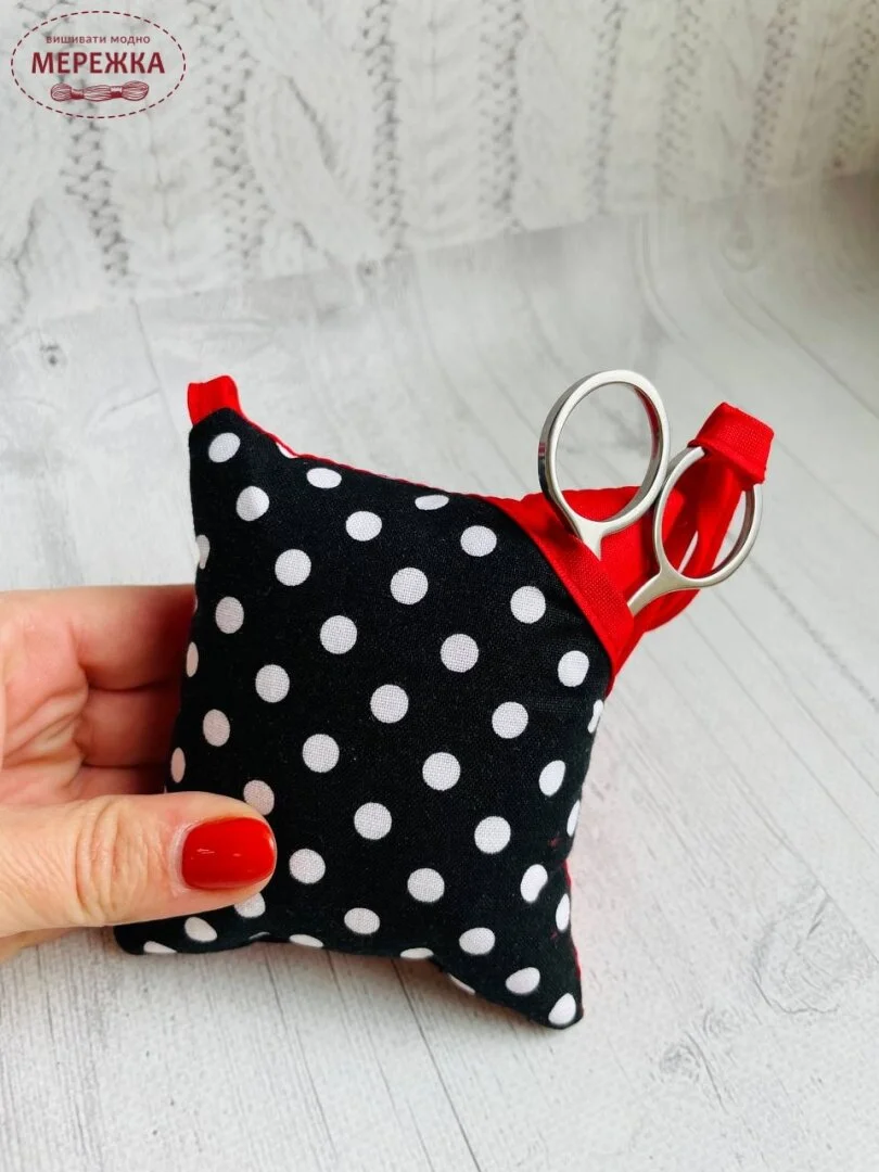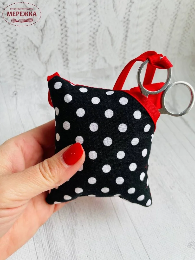 Подушека з бавовняної тканини розміром 10 х 10 х 4 см набита м'яким наповнювачем, що не псує голок.