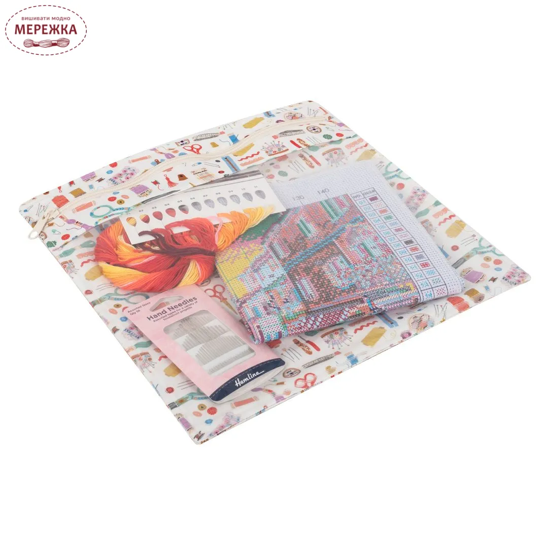 Сумка має прозору передню кишеню на блискавці для зручного перегляду. Додаткова кишеня ззаду ідеально підходить для зберігання схем, ниток і аксесуарів.