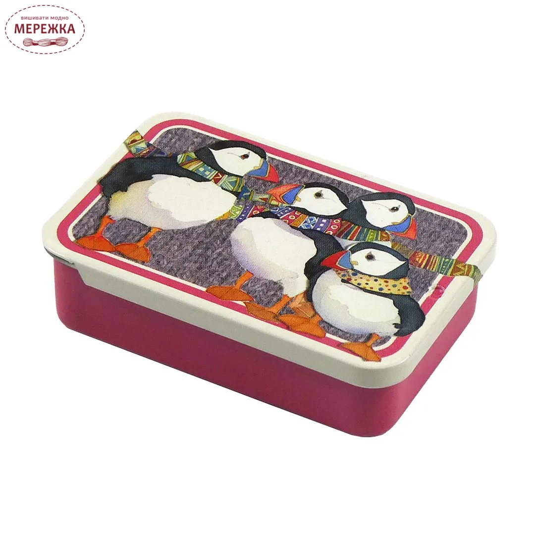 Мініатюрні органайзери з колекції Puffins in Scarves із чудовим принтом для зберігання рукодільних дрібничок: маркерів, голок, шпильок, пінів.