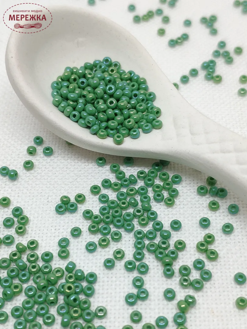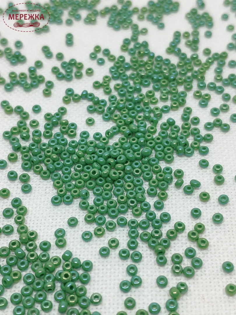 Бісер 54250 круглий, перламутровий, зеленого кольору з райдужним напиленням.