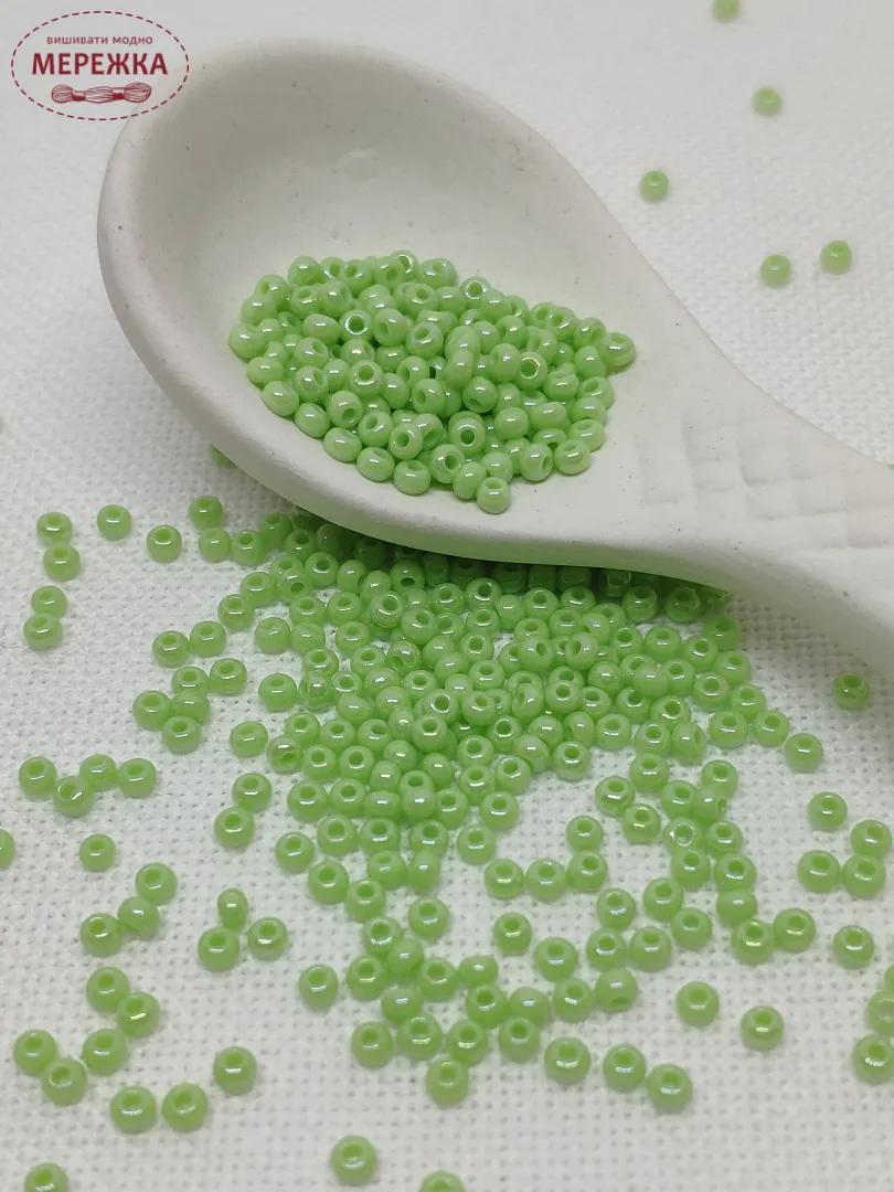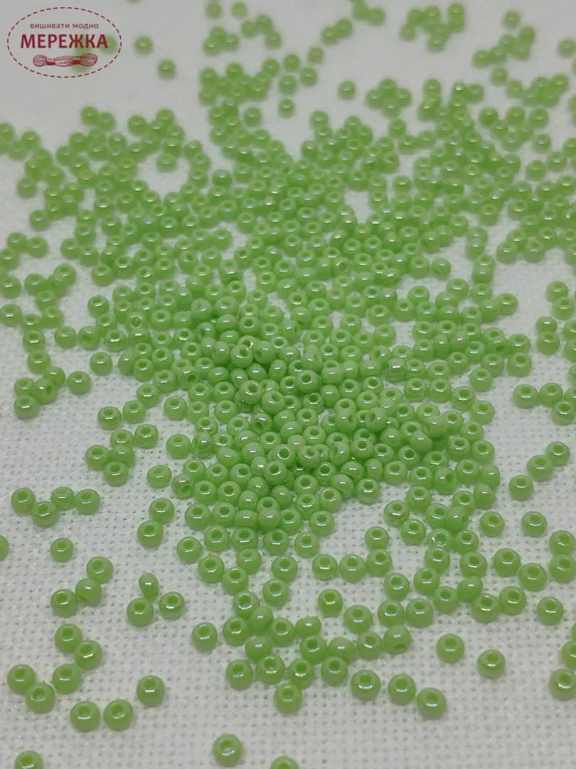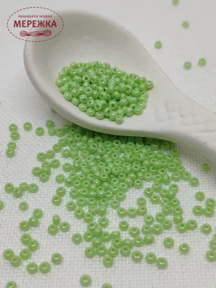 Бісер 54410 круглий, перламутровий, салатового кольору з райдужним напиленням.