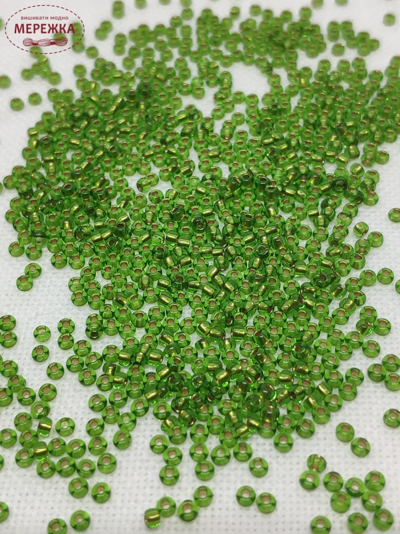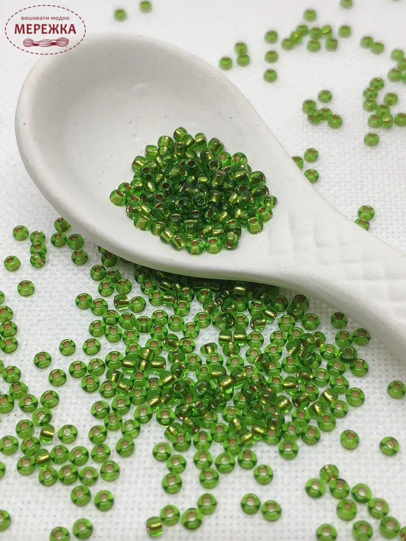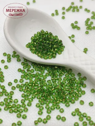 Бісер 55434 круглий, блискучий зеленого кольору.