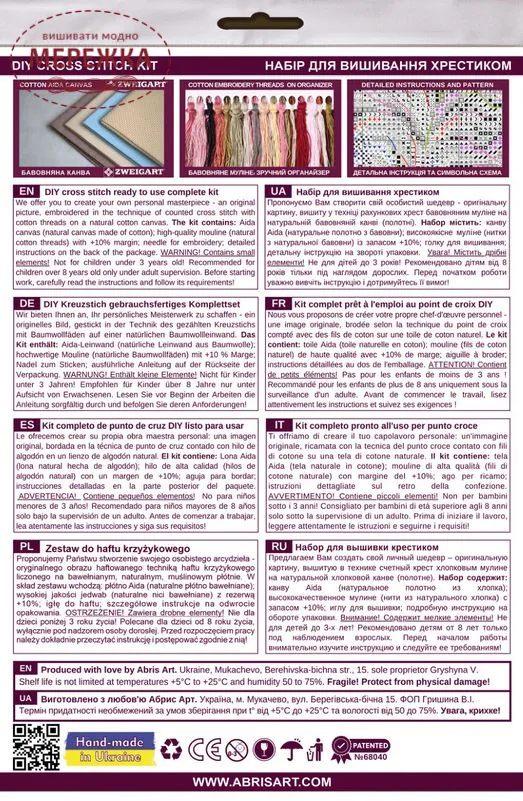 Виробник комплектує свої набори якісними матеріалами від провідних європейських виробників. А небанальні сюжети, ретельно продумані схеми та чіткі інструкції зроблять вишивальний процес легким та захопливим!
