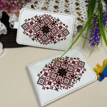 Підходить для усіх стандартних карток, розміром 54 х 85,6мм. (Id-карта, банківська карта, водійське посвідчення, проїзний і т.д.) Містить основу для вишивання та пришивну рамку з чорного шкірозамінника, пластикову вставку.