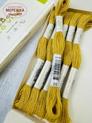 Нитка не підлягає діленню. Товщина нитки Eco Vita орієнтовно відповідає трьом ниткам звичайного муліне.