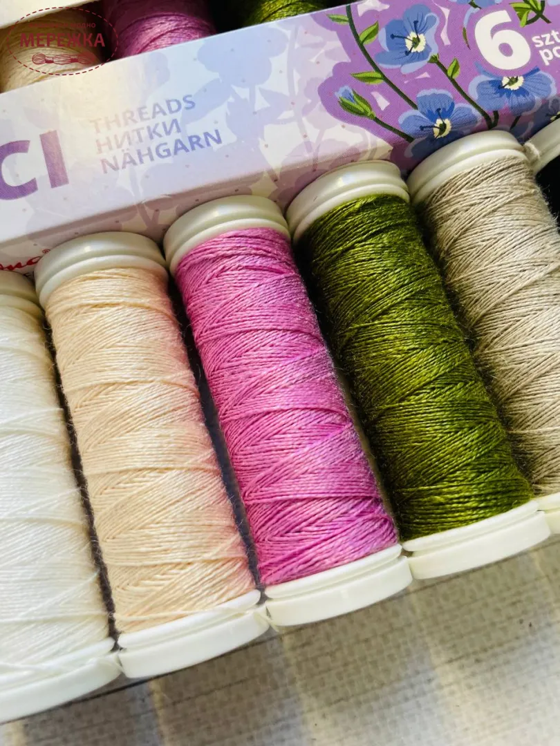 Набір сформований 3 6 котушок швейних ниток, які виготовлені з льону.