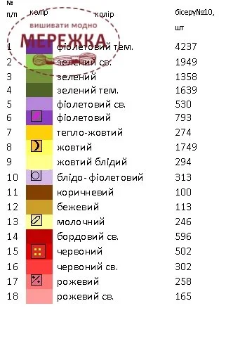 В інструкції зазначена кількість кольорів, котрі використовуються у схемі для вишивання.
