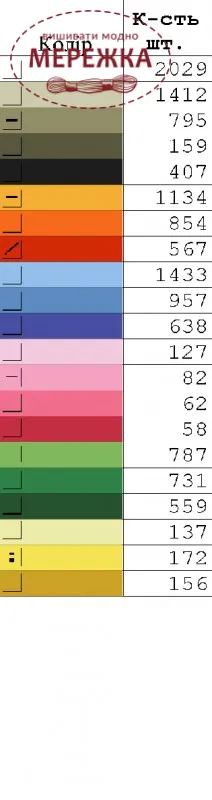 В інструкції зазначена кількість кольорів, котрі використовуються у схемі для вишивання.