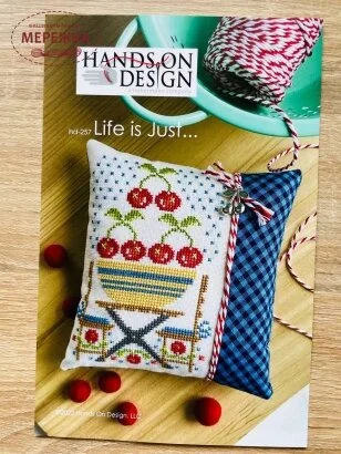 Деякі схеми Hands On Design укомплектовані декоративними елементами від автора - стрічками, відрізами тканин, підвісками тощо. На фото показано потрібні матеріали для вишивання цієї схеми (муліне, тканина, бісер, декоративні елементи).