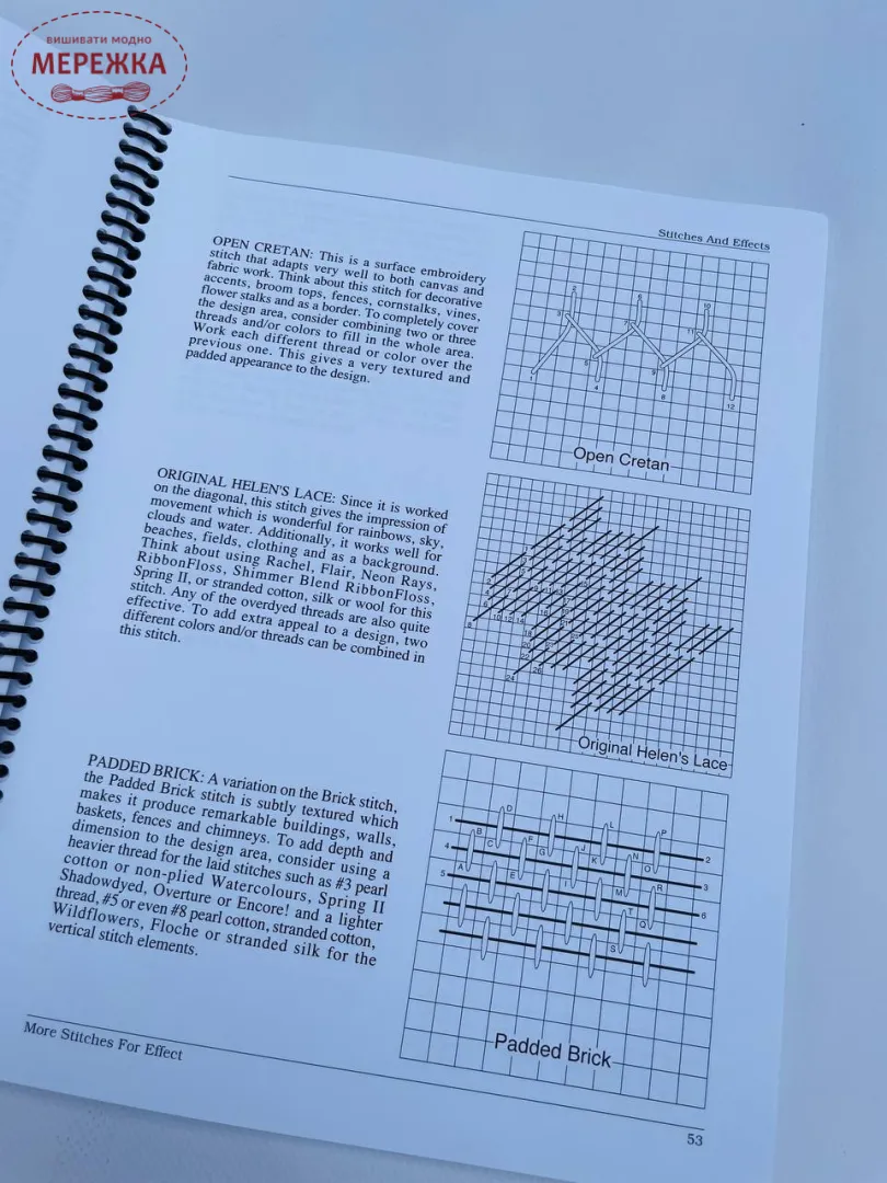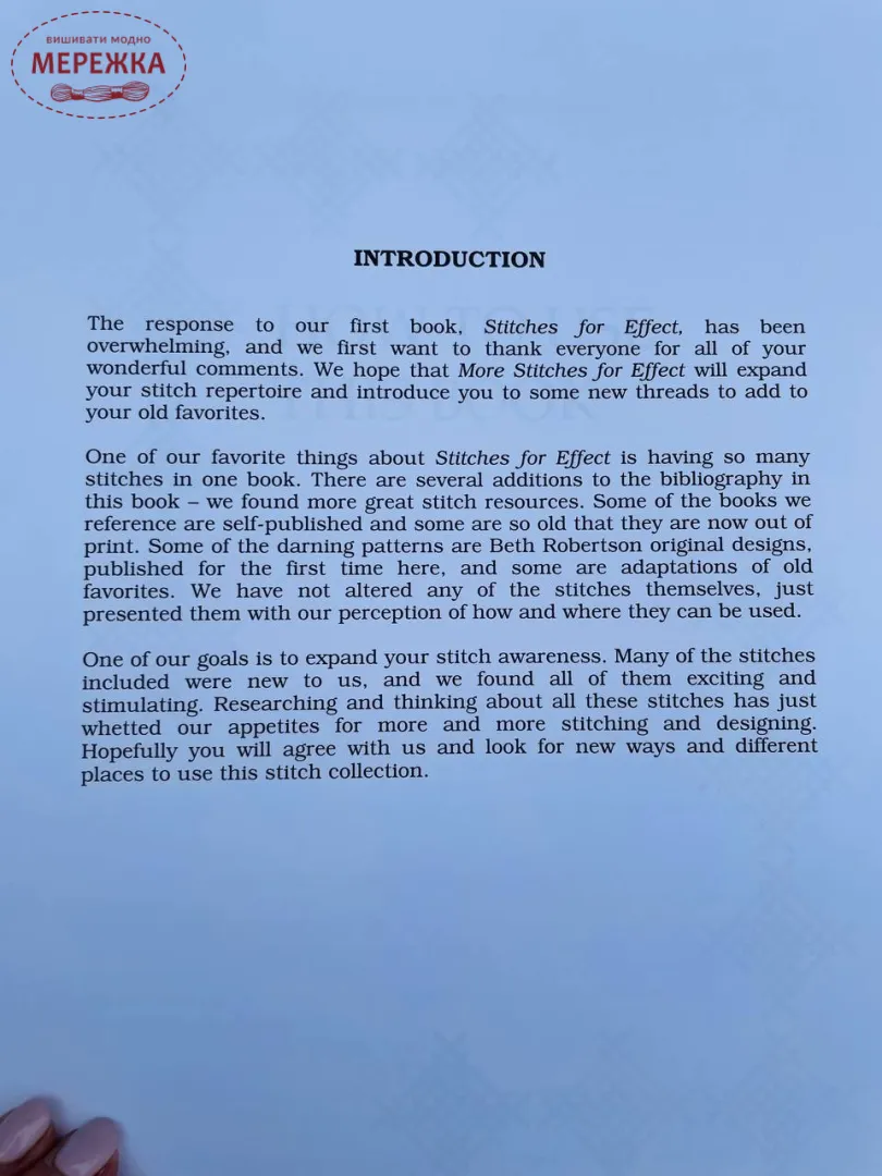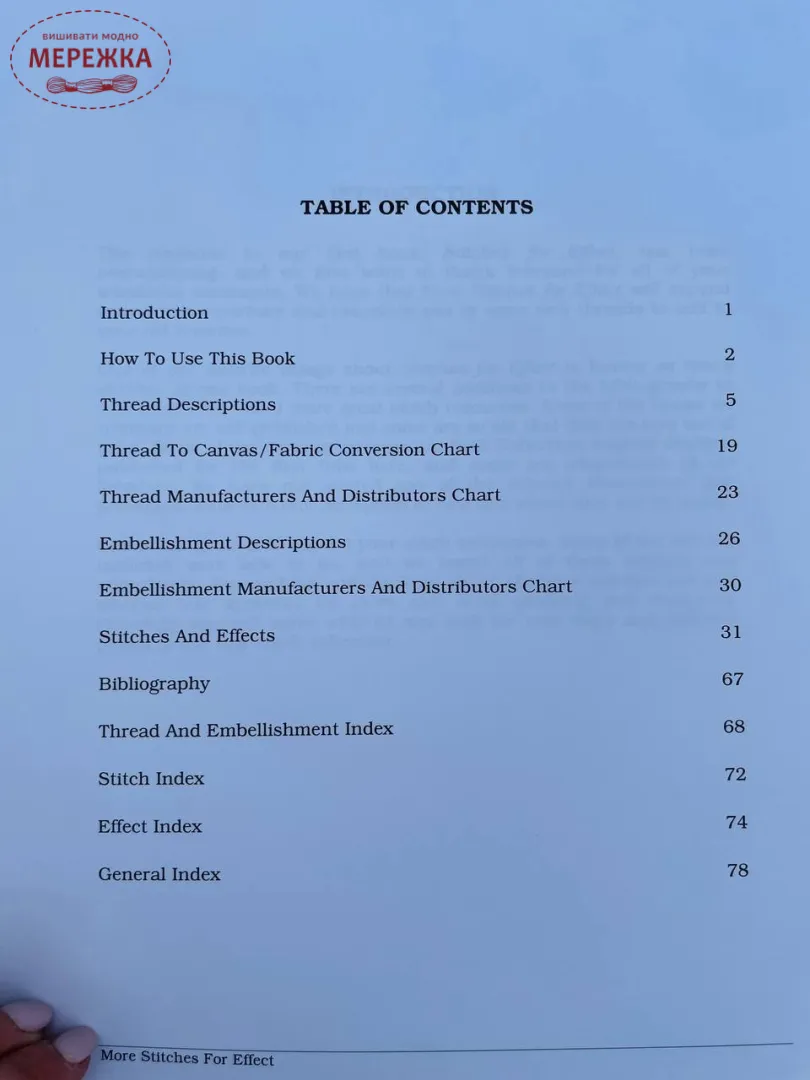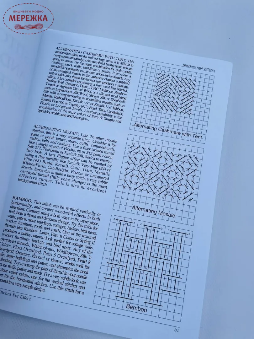 Для кожного стібка в книзі дається детальна інформація з описом ефектів, що він може створити. А також дані його варіації.