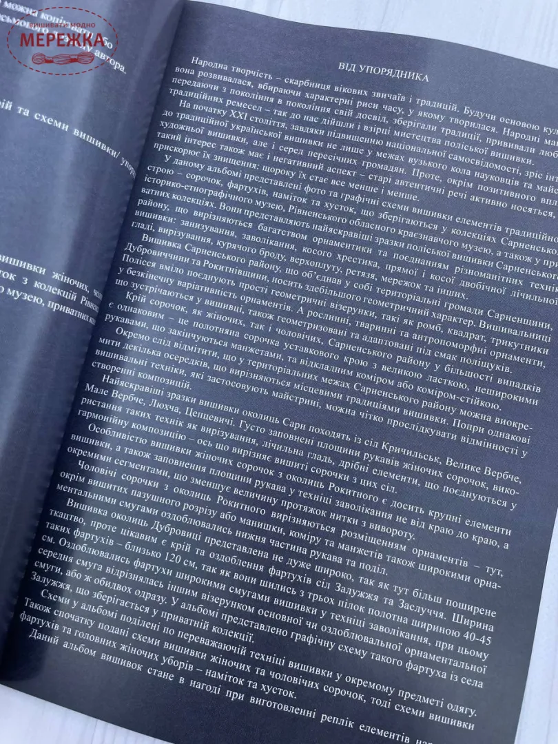 Збірник містить фото, графічні зображення крою та схеми вишивки жіночих, чоловічих сорочок, фартухів та головних жіночих уборів (наміток та хусток) з колекцій Рівненського обласного краєзнавчого музею, Сарненського історико-етнографічного музею, приватних колекцій Сарненського району (районування 2020 року).