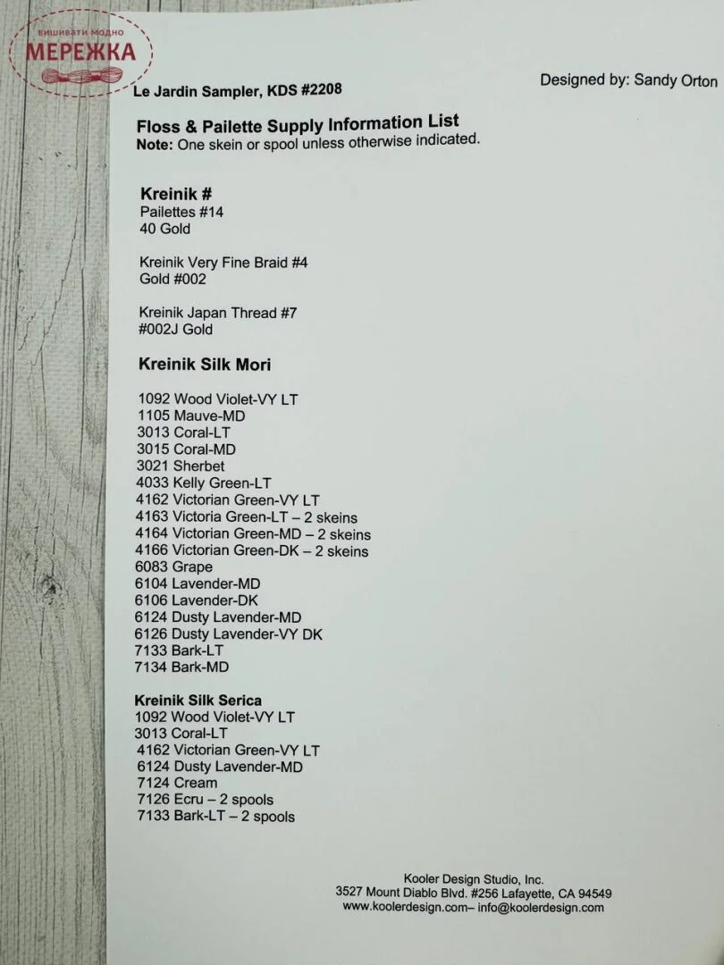 Рекомендовані нитки: Kreinik Very Fine #4 Gold #002; Kreinik Japan Thread #7 #002J Gold; Kreinik Silk Mori: 1092 Wood Violet-VY LT, 1105 Mauve -MD, 3013 Coral-LT, 3015 Coral-MD, 3021 Sherbet, 4033 Kelly Green-LT, 4162 - Victorian Green-VY LT, 4163 Victorian Green-LT-2 skeins, 4164 Victorian Green_MD-2 skeins, 4166 Victorian Green-DK-2 skeins, 6083 Grape, 6104 Lavender-MD, 6106 Lavender-DK, 6124 Dusty Lavender-MD, 6126 Dusty Lavender-VY DK, 7133 Bark-LT, 7134 Bark-MD; Kreinik Silk Serica: 1092 Wood Violet -VY LT, 3013 Coral-LT, 4162 - Victorian Green-VY LT, 6124 Dusty Lavender-MD, 7124 Cream, 7126 Ecru - 2 spools, 7133 Bark-LT - 2 spools