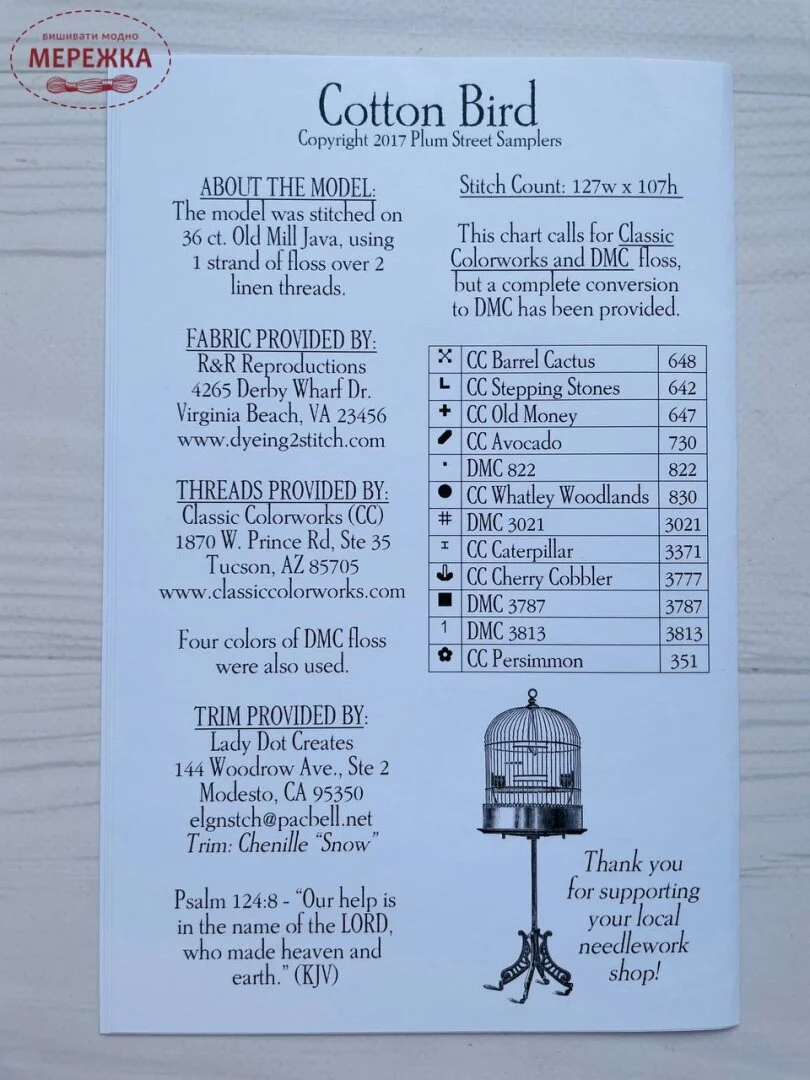 Схема для вишивання від Plum Street Samplers "Cotton Bird".