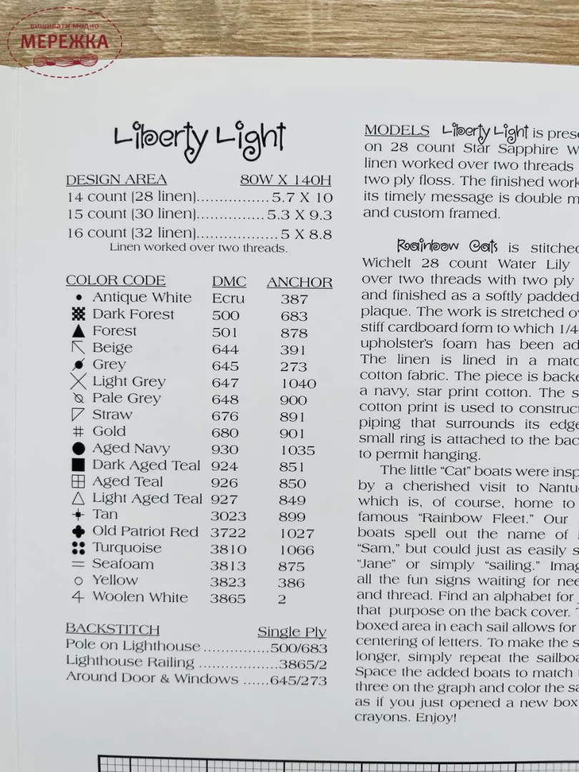 Рекомендовані нитки: DMC Ecru, 500, 501, 644, 645, 647, 648, 676, 680, 930, 924, 926, 927, 3023, 3722, 3810, 3813, 3823, 3865.