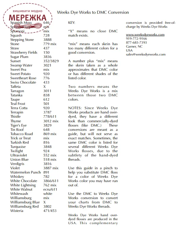 У схемах Терези Когут використовуються тканини та муліне від різних виробників (найчастіше Weeks Dye Works та DMC). Якщо ці матеріали відсутні в нашому магазині, ми разом зможемо підібрати коректну заміну на муліне DMC, що її пропонує автор в своїх схемах.
