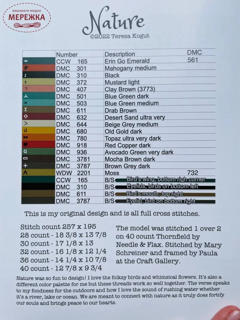 Рекомендовані нитки: CCW Erin Go Emerald; WDW Moss #2201; DMC 301, 372, 407, 501, 503, 611, 632, 644, 680, 780, 918, 936, 3781, 3787 .
