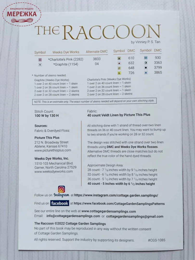 Схема для вишивання хрестиком від Cottage Garden Samplings "The Raccoon".