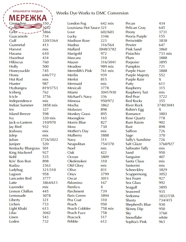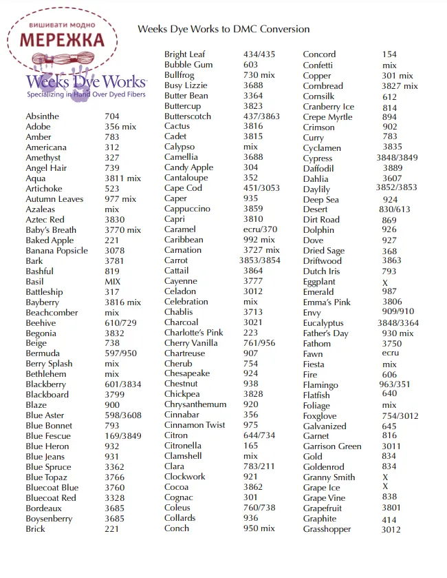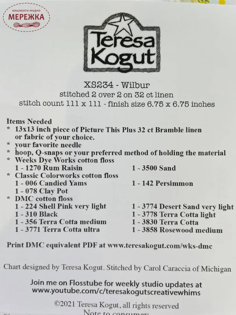 У схемах Терези Когут використовуються тканини та муліне від різних виробників (найчастіше Weeks Dye Works та DMC). Якщо ці матеріали відсутні в нашому магазині, ми разом зможемо підібрати коректну заміну на муліне DMC, що її пропонує автор в своїх схемах.