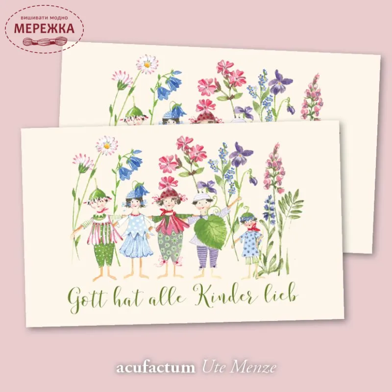 Етикетка з веселими дітками-квітами (мотив розроблений Керстін Хесс) зачаровує і привертає увагу до всіх видів текстильних дизайнів.
