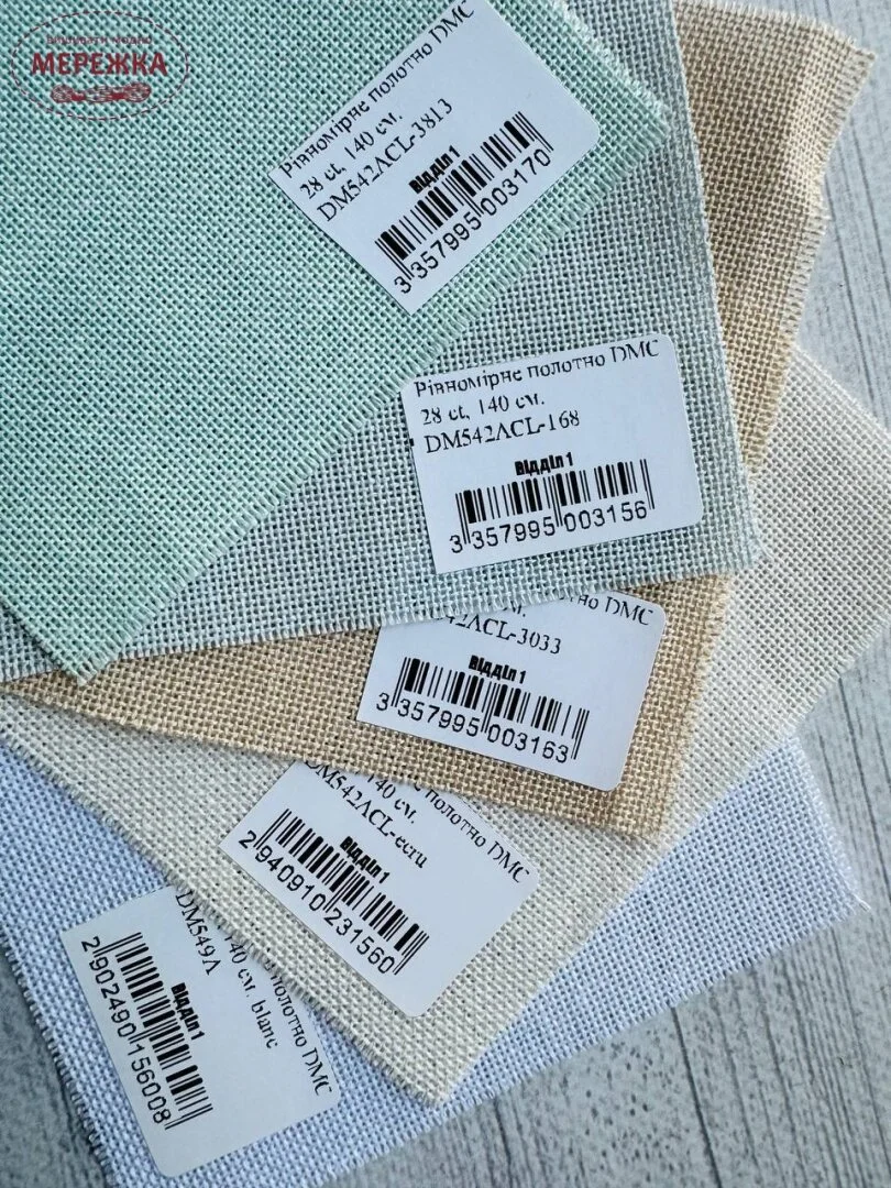 Пропонуємо зразки рівномірних полотен від фірми DMC у 28 каунті (11 ниток у 1 см), до них належать бавовняні та лляні тканини від цього виробника.