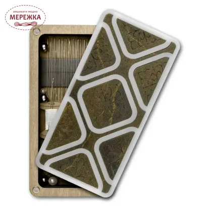 В комплекті вмонтована на дні виробу магнітна стрічка, яка надійно фіксуватиме голки, булавки, шпильки. Скринька закривається кришкою з фанери за допомогою міцних магнитів, тож надійне зберігання голок забезпечене. Чарівний дизайн скриньки теж вартий вашої уваги.