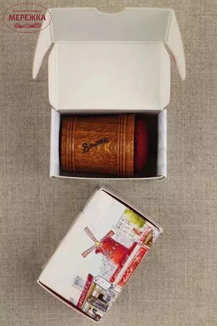 Голківниця для голок у вінтажному стилі виконана у вигляді невеликої бочки, подушечка - із бордового льону.