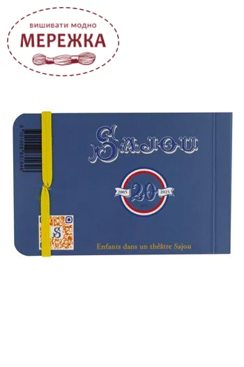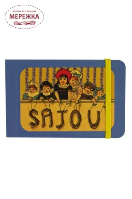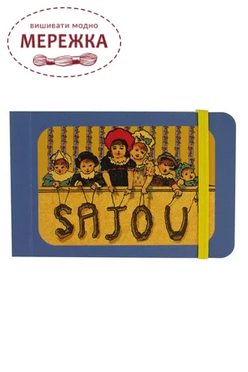 Цей чарівний міні-блокнот застібається на яскраво-жовту гумку. Обкладинка має один з наших улюблених мотивів: діти Сажу в театрі на синьому фоні.