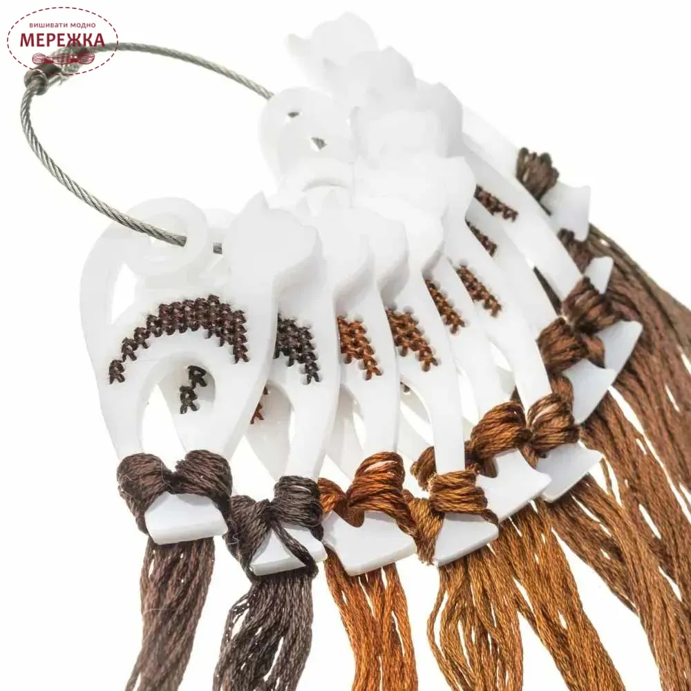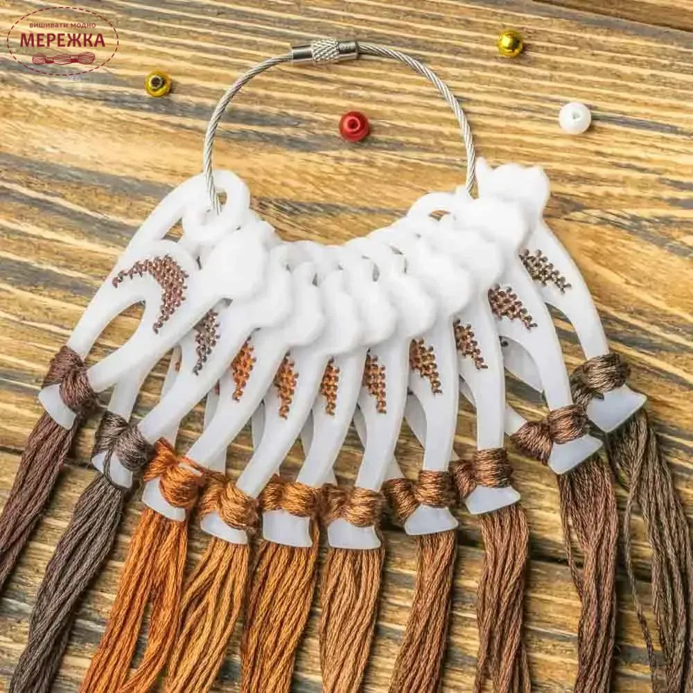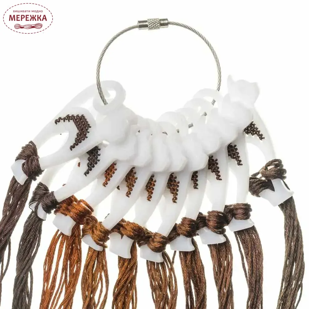 З ним можна охайно зберігати нитки, підбирати кольори та створювати маленькі зразки вишивки, щоб оцінити поєднання кольорів. Органайзер легкий, його зручно тримати в руці та об’єднувати в набір за допомогою металевого тросика.