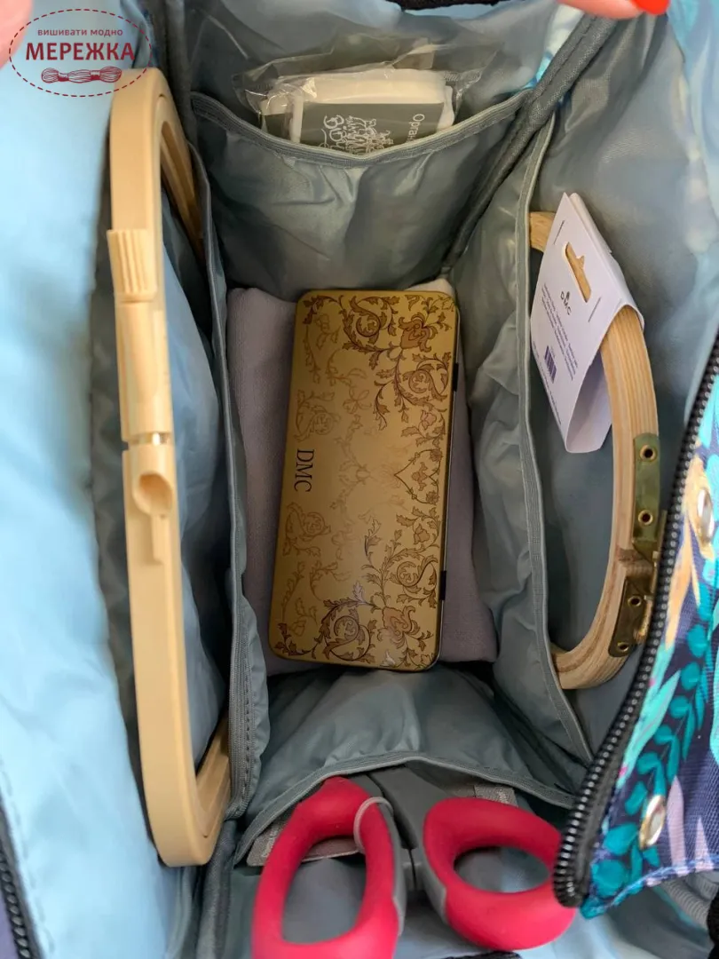 В середині даної сумки є безліч секцій та кишень для рукодільних аксесуарів, поточного процесу та дрібної галантереї.