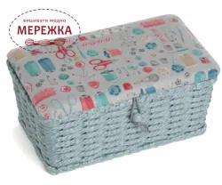 Скринька для шиття та рукоділля середнього розміру, обтягнута бавовняною тканиною.