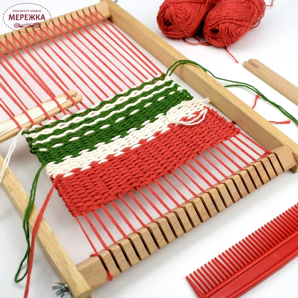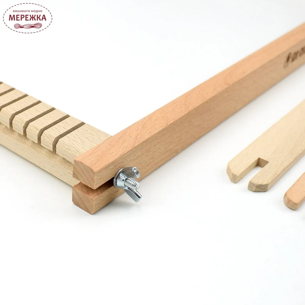 Дерев'яна рама-основа розміром 23 х 34 см має 22 канали для ткання полотна.