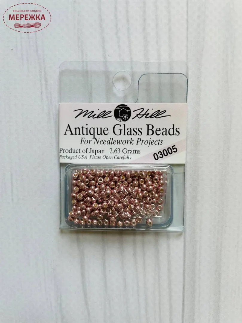 Бісер Mill Hill - японського виробництва, проте розфасований в США. Він найвищої якості, не линяє під час прання, колір та розмір відповідає номеру вказаному на упакуванню.