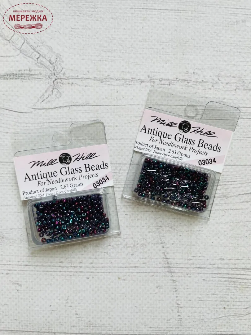 Бісер Mill Hill - японського виробництва, проте розфасований в США. Він найвищої якості, не линяє під час прання, колір та розмір відповідає номеру вказаному на упакуванню.