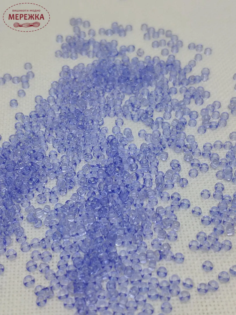 Бісер 01231 прозорий, круглий з легким відтінком синього кольору.