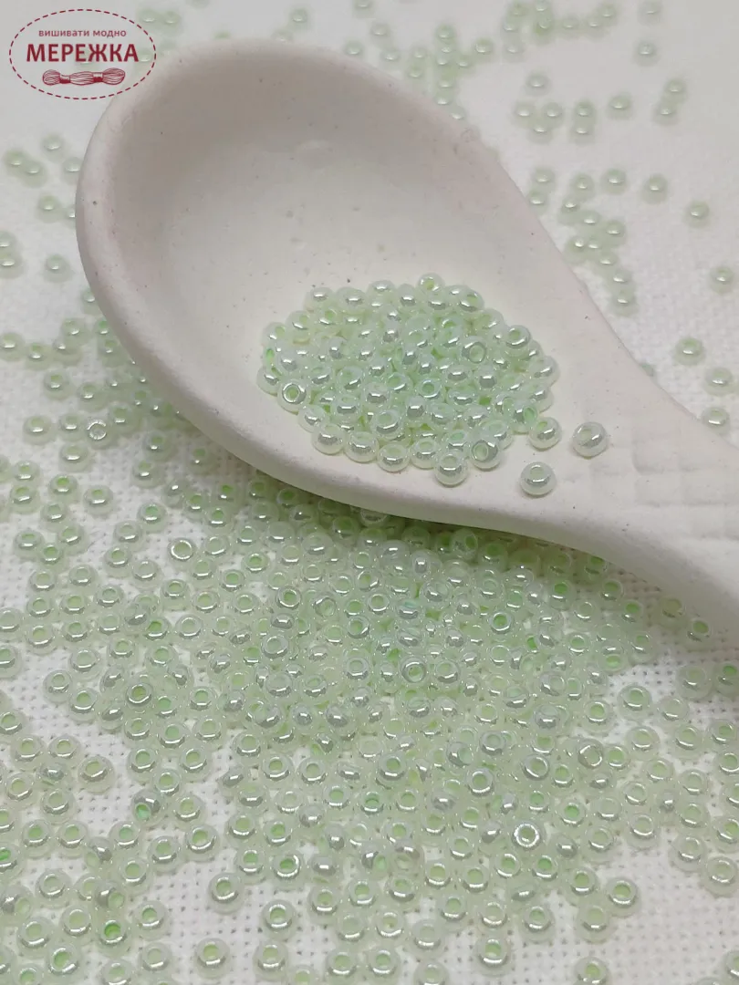 Бісер 37152 круглий з промальованою серединкою блідо-зеленого кольору.