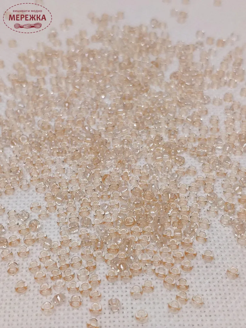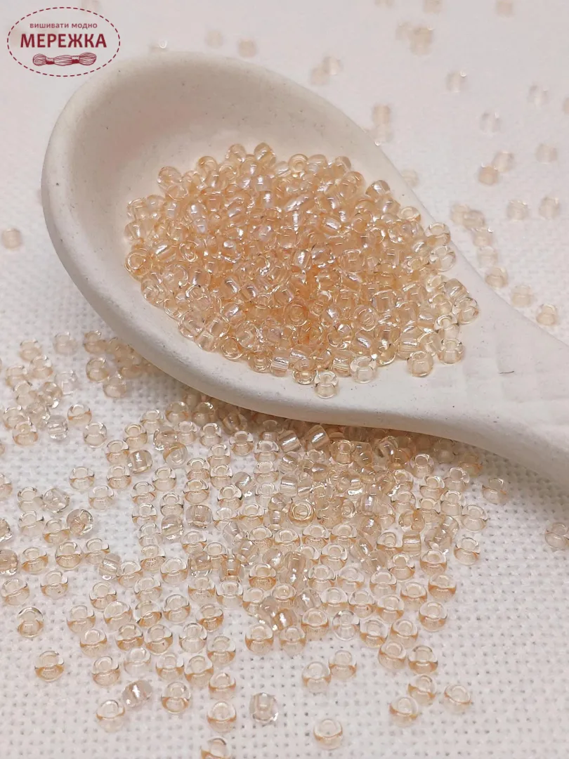 Бісер 38218 круглий, прозорий з промальованою серединкою персикового кольору.