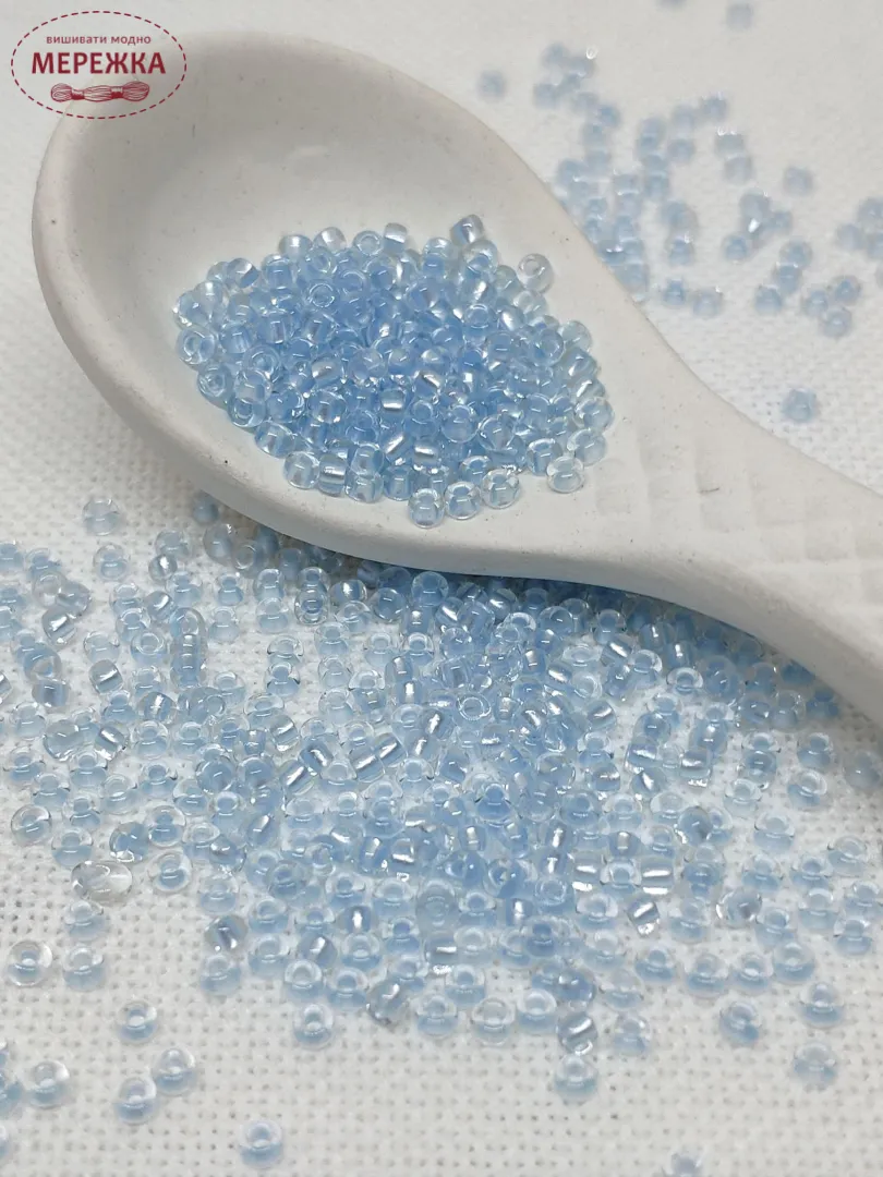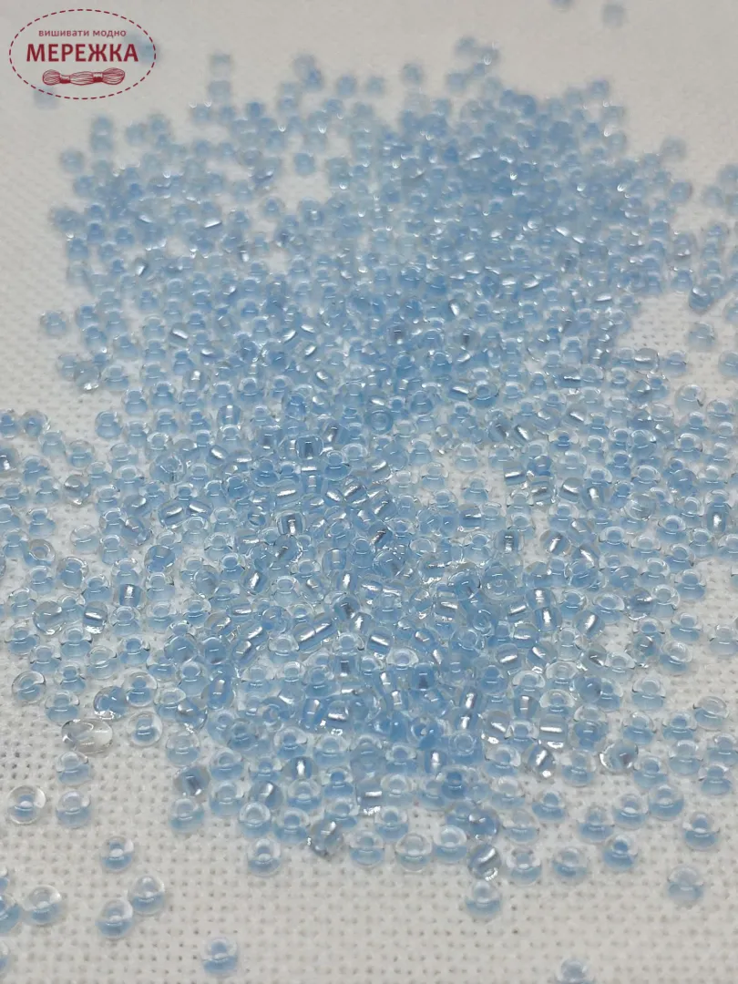 Бісер 38236 круглий, прозорий з промальованою серединкою голубого кольору.