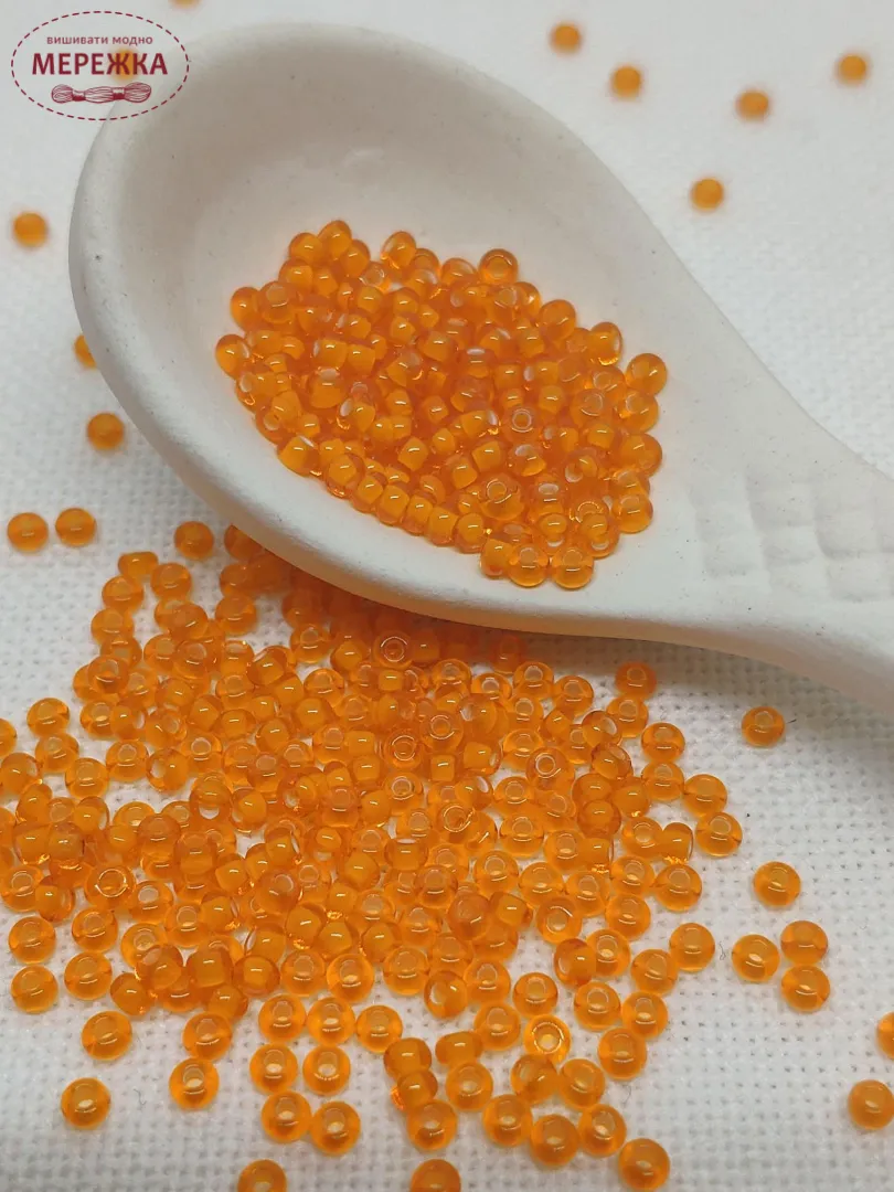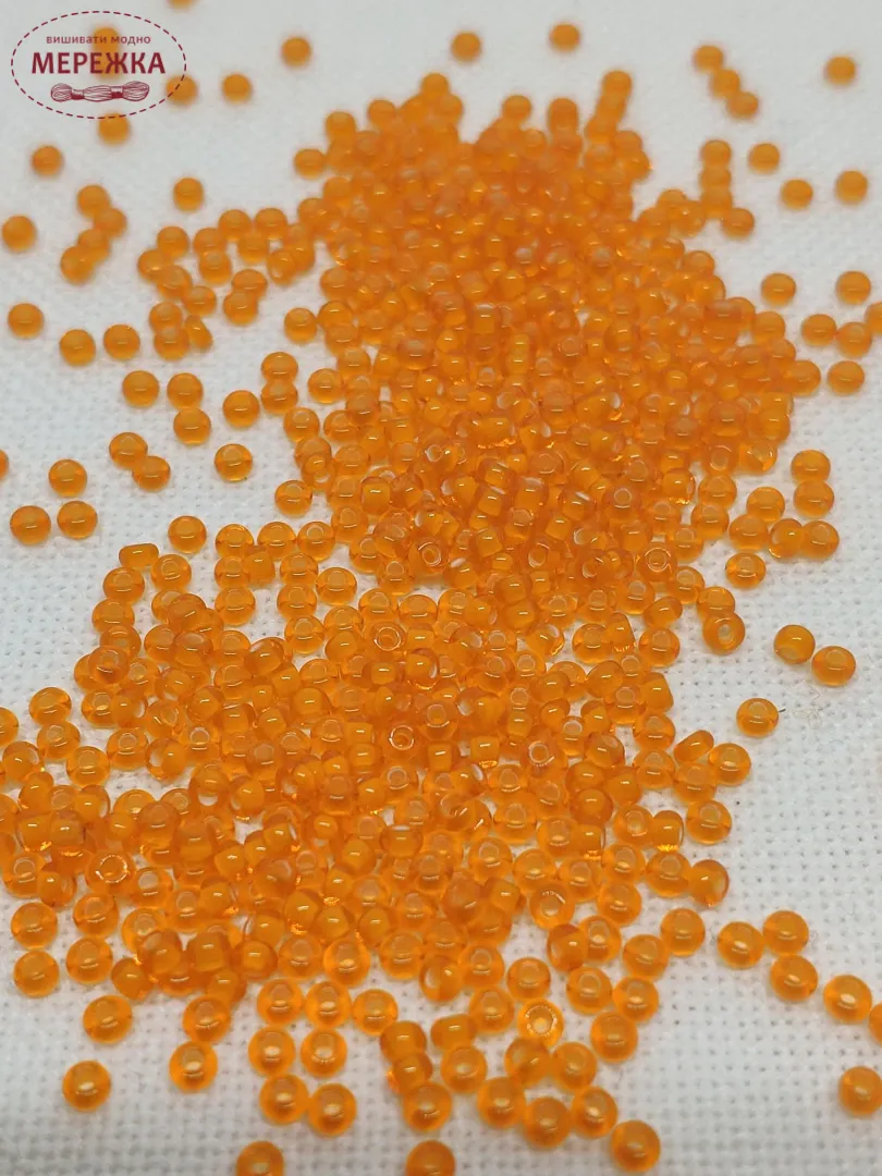 Бісер 95006 прозорий, помаранчевого кольору з серединкою білого кольору.