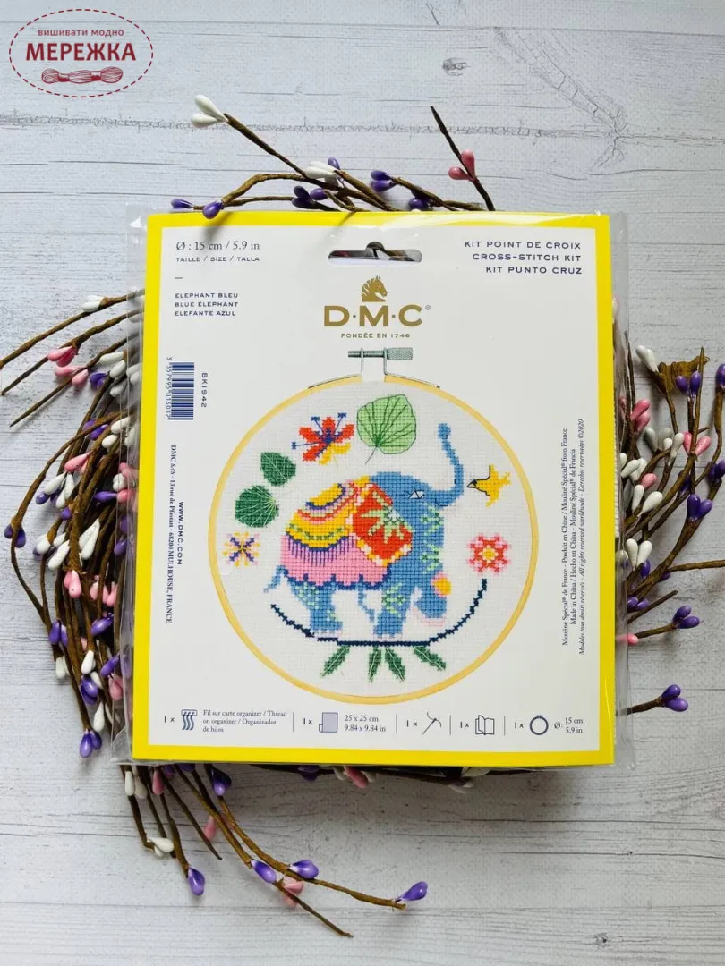 Набір для вишивання хрестиком від фірми DMC укомплектований усім необхідним, до складу набору ще додатково входять п'яльця.