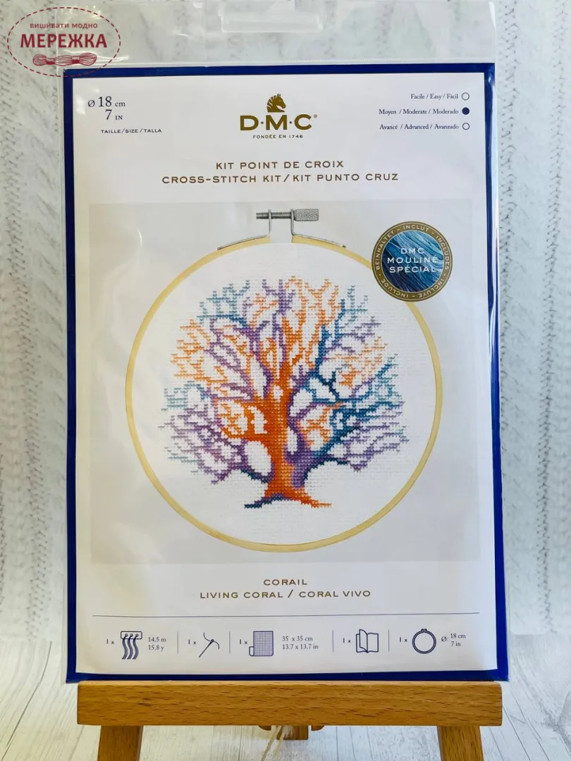 Набір для вишивання хрестиком від фірми DMC укомплектований усім необхідним, до складу набору ще додатково входять п'яльця.