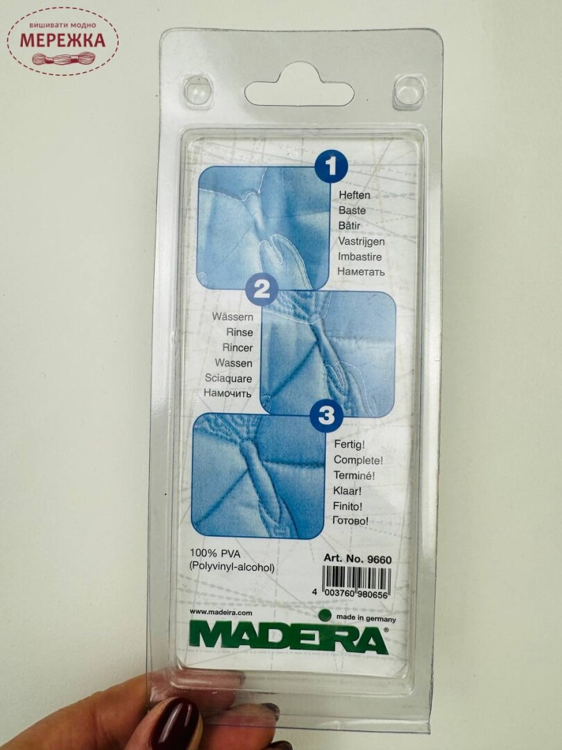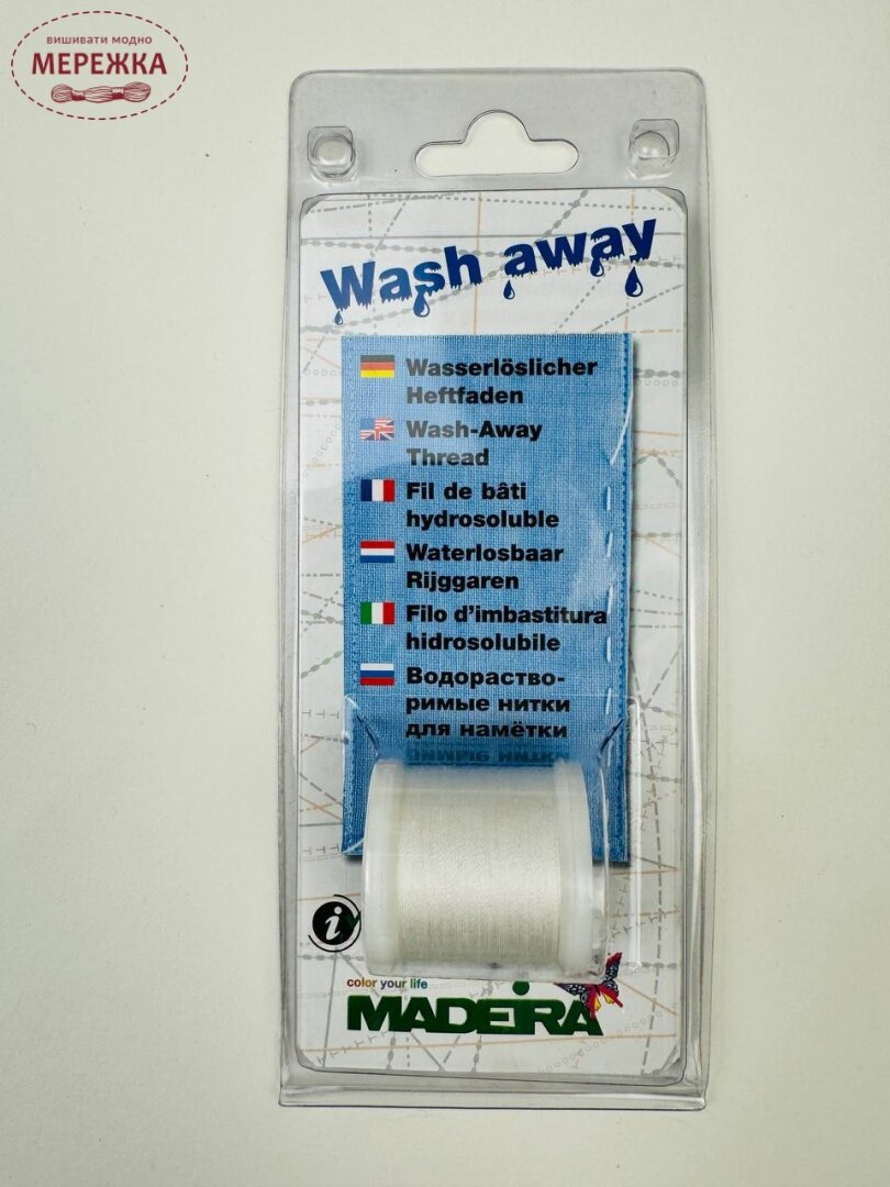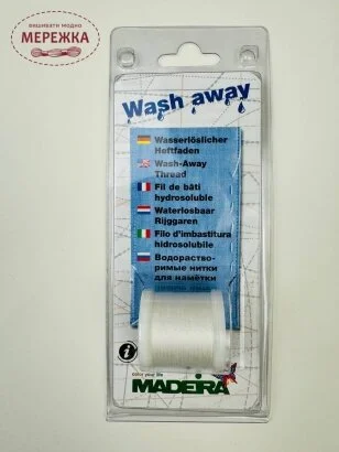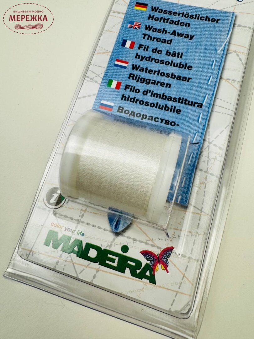 Водорозчинна нитка Madeira використовується як звичайна швейна нитка, проте після контакту з водою чи парою зникає.