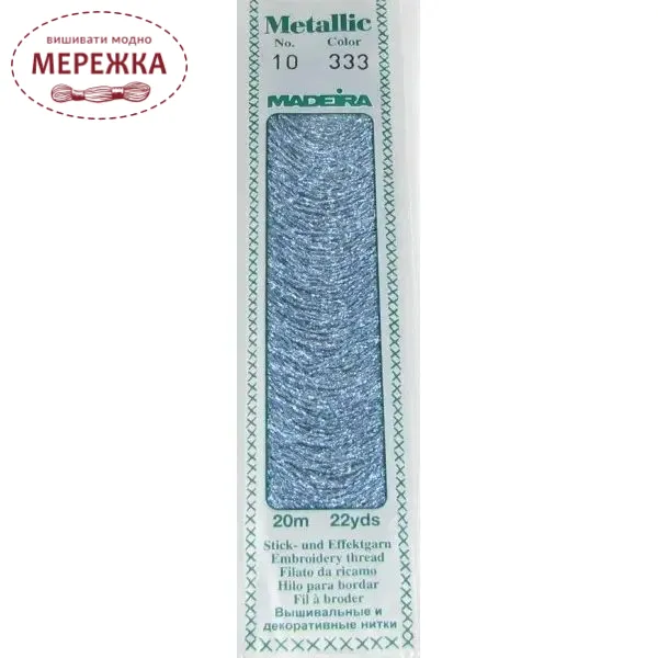 Універсальна металізована нитка чудово підходить для всіх видів вишивки, в'язання гачком, плетіння, мережива, ручної стьобки та рукоділля. Металізована нитка № 10 відкриває новий світ мерехтливих ефектів. Французькі вузлики з металевою ниткою № 10 підкреслюють будь-який проєкт з вишивки та в'язання, а 24 чудові кольори додають казкового додаткового виміру будь-якому креативному дизайну. Використовуйте її, щоб додати блиску, тонких деталей та цікавості разом із шовковою ниткою MADEIRA або бавовняним муліне.