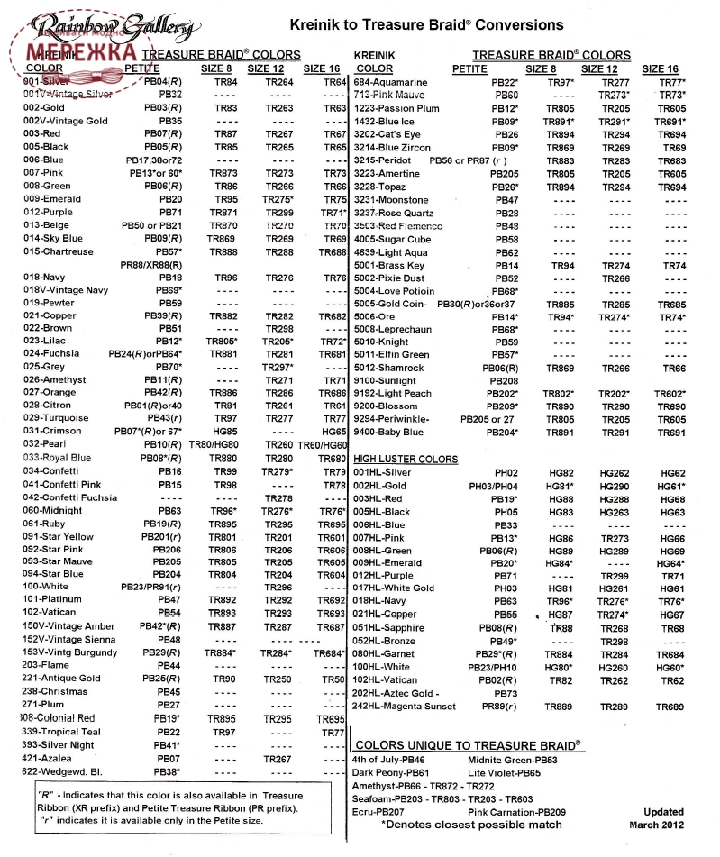 В доданих зображеннях знайдете табличку відповідності кольорів ниток Kreinik ниткам від Rainbow Gallery.