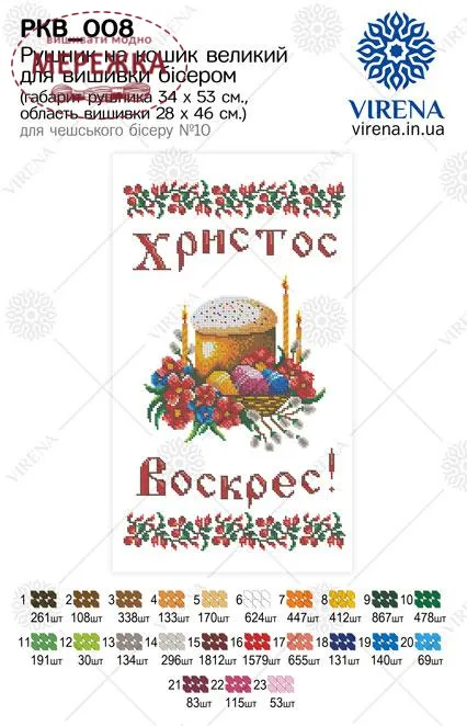 Схема для вишивання бісером великоднього рушника РКВ-008 від виробника "Virena". З зображенням великодньої паски та писанок.