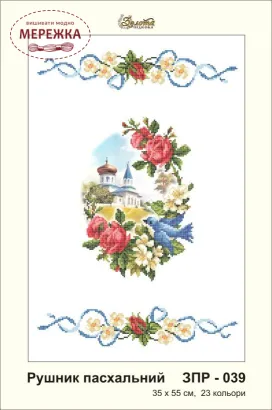 Схема для вишивання бісером великоднього рушника ЗПР-039 від виробника "Золота підкова". З зображенням квіткового вінка на фоні церкви.