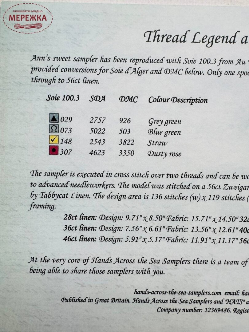 Hands Across The Sea Samplers Limited - це студія дизайну, яку заснували дві подруги. Студія спеціалізується на відтворенні вишуканих антикварних взірців вишивки з музейних зразків.